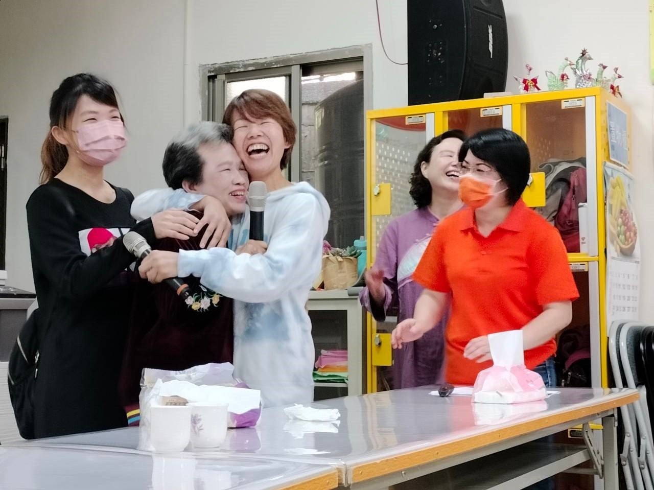阿寶阿嬤兩名女兒到場聆聽母親的故事,只知母親扶持一家非常辛勞,對於母親童年的遭遇和坎坷卻不甚清楚,在聆聽後不覺熱淚盈眶,抱著母親又哭又笑,也感謝促進會舉辦這場「道愛與道謝感恩party」。