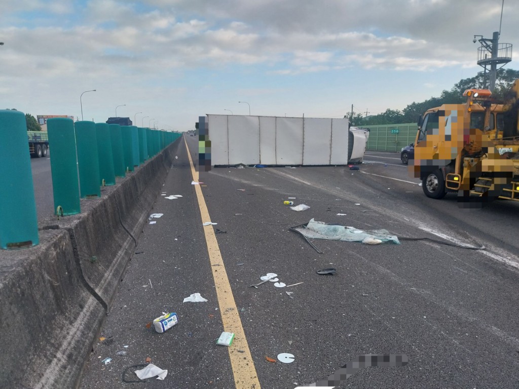 國1嘉義民雄段大貨車變換車道失控側翻 駕駛輕傷送醫