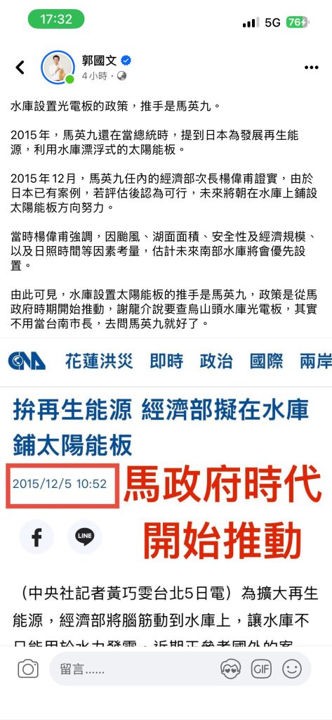 郭國文陸續在臉書發文,相關烏山頭水庫光電系統澄清訊息,十三日又在臉書以「國民黨蔡育輝想洗風向,但有照片證明你覺得烏山頭光電『讚』!」為題,內容提及蔡育輝把自己形塑成從頭到尾都反對水庫設置光電板,但七月市議會考察時,在烏山頭水庫光電板前比讚,肯定光電板的安全性。