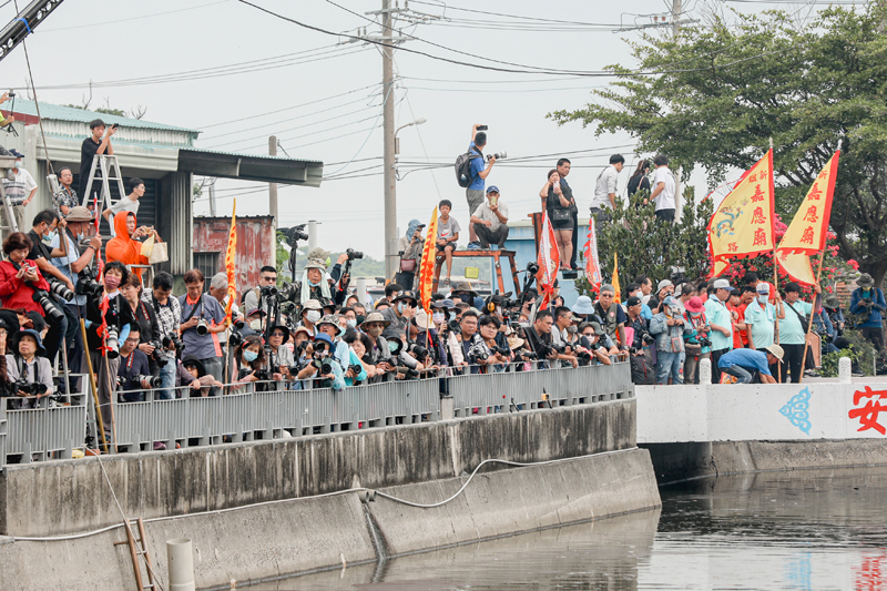 新塭嘉應廟「衝水路、迎客王」活動,吸引來世各地的攝影同好捕捉珍貴畫面。(記者張翔攝)