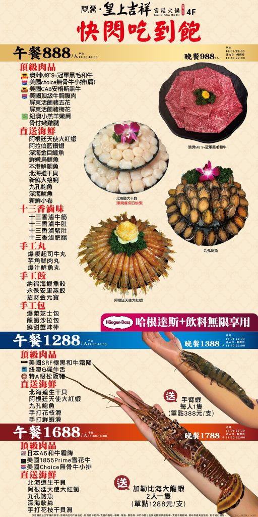 8月20日起「問鼎 ‧ 皇上吉祥」全台四家門店同步推出全新的【快閃吃到飽】超值方案,方案共有三種分別是「888/1288/1688」起(晚餐及假日需酌加100);平日午餐只要888元起就可無限享受頂級和牛、美國無骨牛小排(肩)、天使大紅蝦、北海道大干貝、九孔鮑魚等奢華食材,還可無限享用手工鍋物配料、至少16種的哈根達斯冰淇淋通通吃到飽,頂級奢華,十分超值。