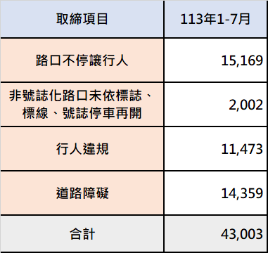 市警局指出,經統計,新北警方113年1至7月取締「路口不停讓行人」共1萬5,169件、「非號誌化路口未依標誌、標線、號誌停車再開」共2,002件、「行人違規」共1萬1,473件及「取締道路障礙」共1萬4,359件;其中分析行人違規樣態,以「行人不依標誌標線號誌之指示或警察指揮」及「行人不依規定擅自穿越車道」最多,提醒民眾穿越道路時,應依規定行走行人穿越道、人行天橋或人行地下道穿越,並依交通指揮人員之指揮或號誌之指示前進。