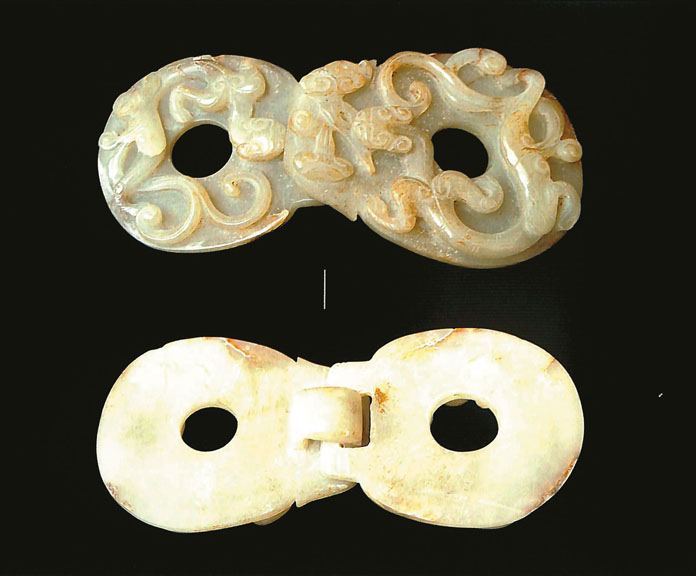 2、螭紋玉帶扣(圖五):江蘇省溧水縣城南柳家村出土,題材由兩隻螭龍所構成,工藝以剃地高浮雕琢成,背面無紋。螭龍身軀較宋代虯健有力,整體表現也較宋代靈動。