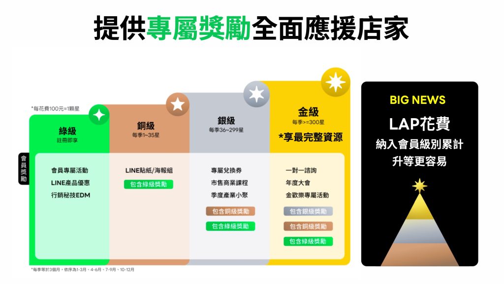 LINE 自 2024 年推出「商家俱樂部」提供會員店家行銷資源與成長機會,幫助強化店家與好友關係,會員經營的官方帳號訊息點擊率優於非會員 36%。「商家俱樂部」推出一年以來會員數已達 10 萬,只要在LINE官方帳號上,每花費台幣 100 元即可獲得 1 顆星,根據每季累積的星星數量可成為綠、銅、銀、金四大級別會員,不同級別可解鎖專屬行銷月報、經營交流會、廣告金、課程兌換券及品牌曝光升級等多重獎勵。