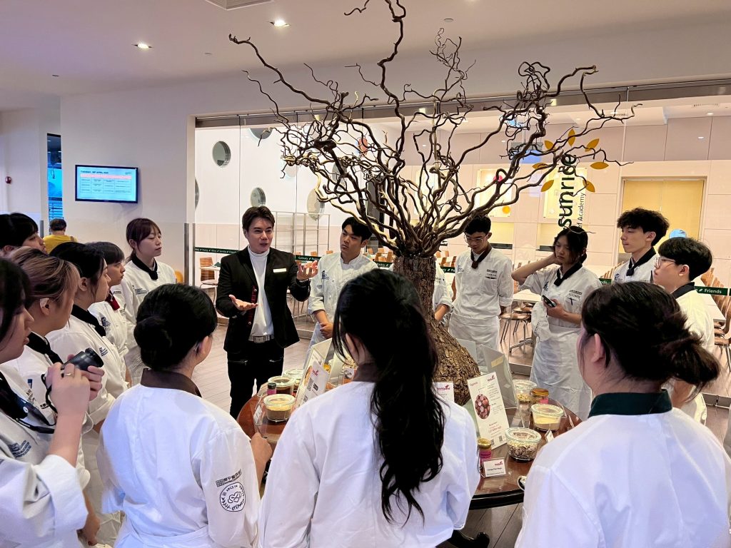 在新加坡期間,學生參訪了At-Sunrice廚藝學院,進行新加坡特色料理-叻沙海鮮麵的實作體驗,以及課程交流等課程。其中,學生除了對香料運用及料理文化展現極高興趣,也對學習如何將廚餘如黃豆渣、蛋殼、茶葉等進行創新再利用。趁此機會,學生也試吃了以蛋殼為原料製成的麻辣蛋殼鹽產品,這場學習讓學生對「餐飲永續」有了具體的認識,也啟發他們思考食材運用的更多可能性,拓展對未來餐飲的想像力。此外,學生也走訪新加坡知名的珍寶海鮮集團,不僅親手實作融合粵菜元素的荔茸帶子創意料理,還深入了解珍寶的品牌發展與人才培育策略,對未來職涯方向有了更明確的藍圖與靈感,甚至提高了對語言學習的動力。這趟旅程讓學生深覺需要培養的不止是技能專業,語言及創新思維更是提高競爭力的重要能力。