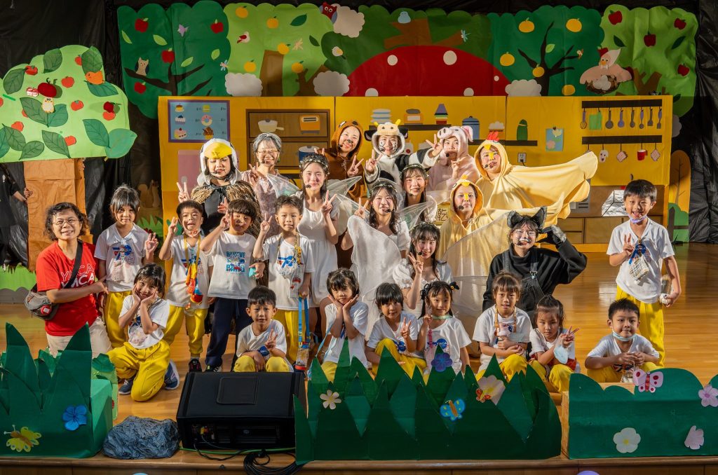 兒童劇同時結合人工智慧技術,學生運用AI輔助創作主題曲〈尋找食材趣〉,並融合自編唸謠、古典音樂與現場樂器音效,打造豐富層次的聽覺享受,展現學生在創意整合與實務操作上高度能力。