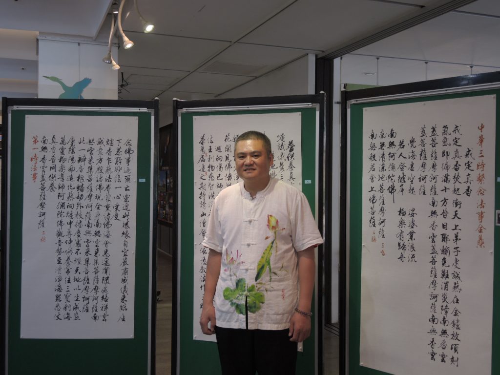 目前正值武漢肺炎疫情肆虐,為此次個展費時一個多月完成「三時繫念」經文篇幅長達四十幅,正是以書法祈福與佛法息災兩相融攝之體現。