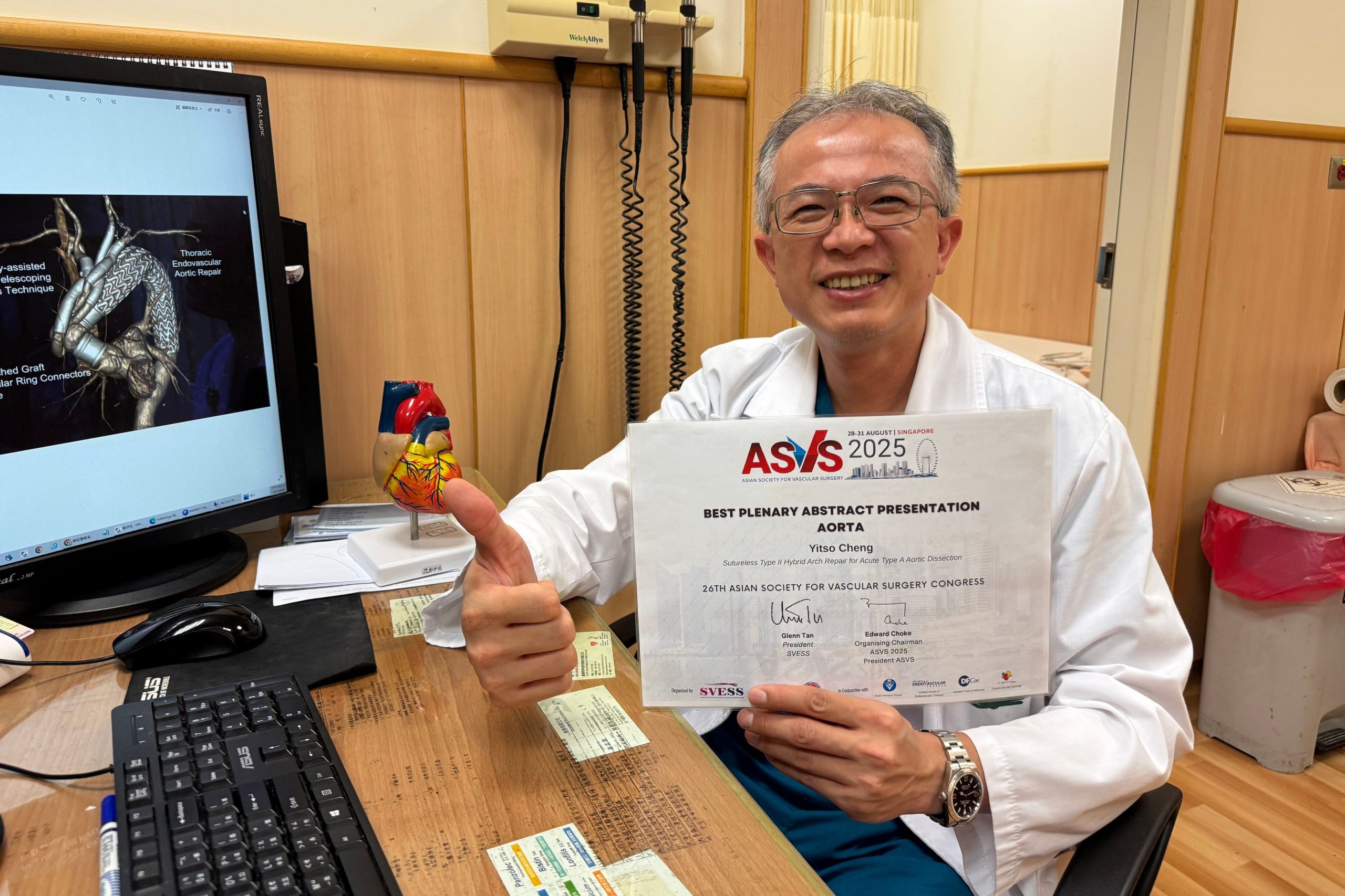 台中慈濟心臟外科醫師鄭伊佐表示,「免縫合式主動脈弓混合型手術」3步驟,使急性主動脈剝離手術更快、更安全。(記者徐義雄攝)