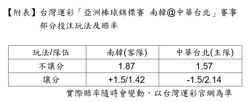 2026年亞洲棒球錦標賽開打,中華隊首戰以14:0輕取巴勒斯坦,今(9/23)日將於台灣時間18:30進行第二場小組賽、對戰強敵南韓。台灣運彩提供單場投注,不讓分玩法賠率中華台北1.57倍,南韓1.87倍,看好中華隊有機會搶下小組賽二連勝。本場賽事中華隊是主隊,投注時要特別注意。