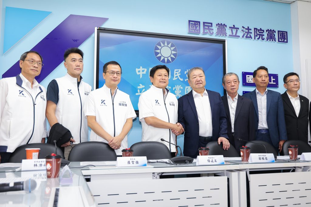 國民黨立法院黨團總召傅崐萁(左4)、書記長羅智強(左3)、首席副書記長林沛祥(左2),30日與縣市議會議長一行人就助理費修法事宜交換意見。會前,傅崐萁與新北市議長蔣根煌(右4)握手合影。(中央社