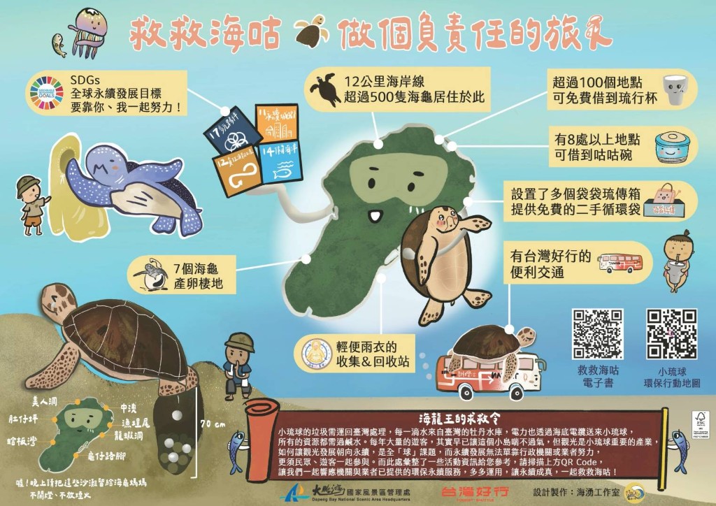 小琉球是全台灣綠蠵龜最密集的海域之一,為力求永續發展,交通部觀光署大鵬灣國家風景區管理處特別推出電子書「救救嗨咕.做個負責任的旅人」,內容以可愛插畫風提供許多友善旅遊地的方法及科普知識,邀請旅人們在享受小琉球之美的同時,也能輕鬆落實負責任旅遊。
