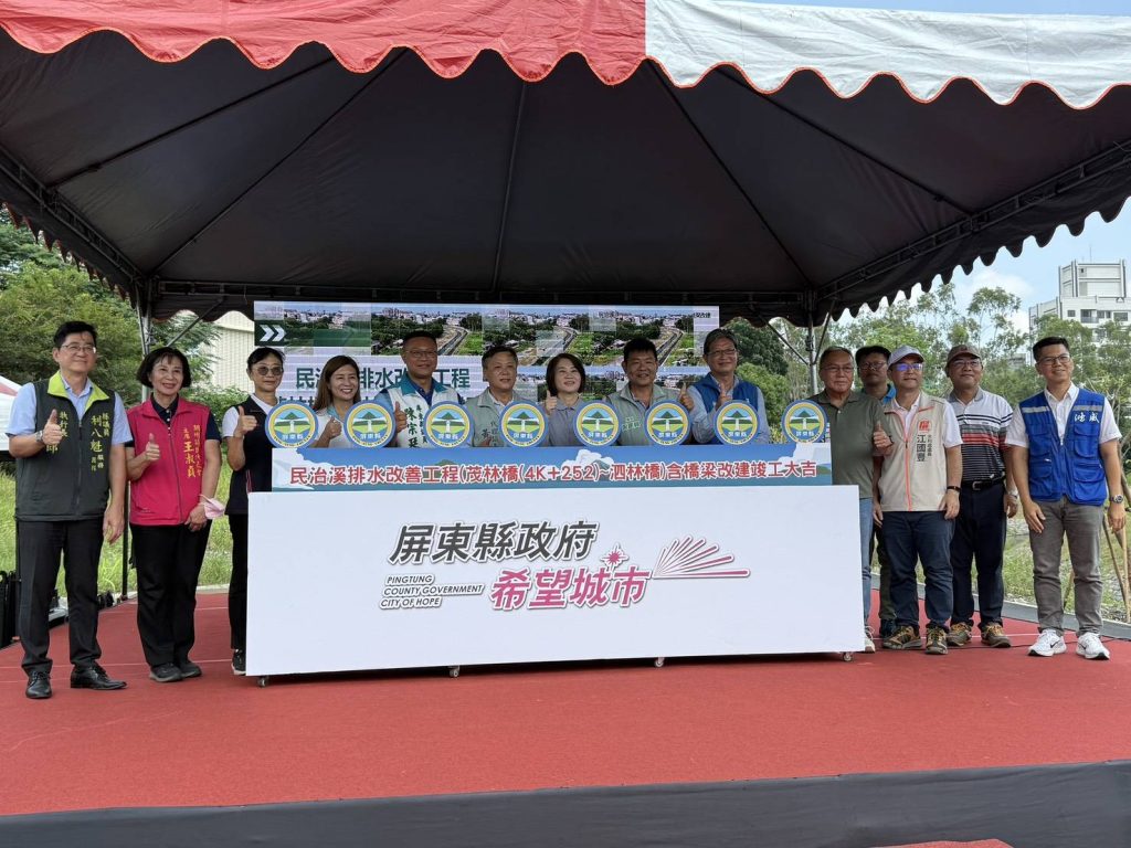 屏東縣政府為改善潮州鎮民治溪因河道蜿蜒及防洪寬度高度不足的淹水情形,向經濟部水利署爭取排水改善工程補助一點五八億元,加上縣府自籌一千五百萬元,總經費達一點七三億元,於去年三月開工後,二日辦理竣工典禮。縣長周春米表示,此次河道拓寬、新建護岸、改建橋梁等工程歷時一年半,達提升排水與防洪效能,也融入生態景觀,打造更友善的親水環境。