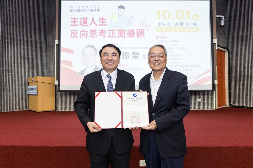 海大許泰文校長頒發感謝狀予施振榮董事長。(海大提供)
