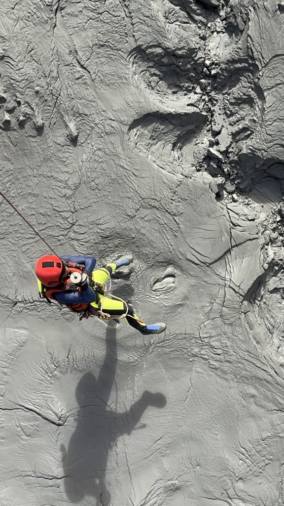 林業保育署表示,現場觀測壩體土石鬆散缺乏穩固支撐,評估無法供直升機降落,特地協調二位特搜教官隨行,從機上垂降至壩頂探測地表狀況及協助安裝機具,經照片顯示,依舊一踩即陷,地表呈現軟爛狀,極為泥濘且鬆軟,足陷至少十餘公分,行走困難,直升機確實無法降落。