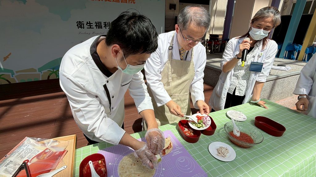 營養科廚師洪意翔於現場示範「柚香雞肉莎莎醬塔可餅」製作。(衛福部基隆醫院提供)