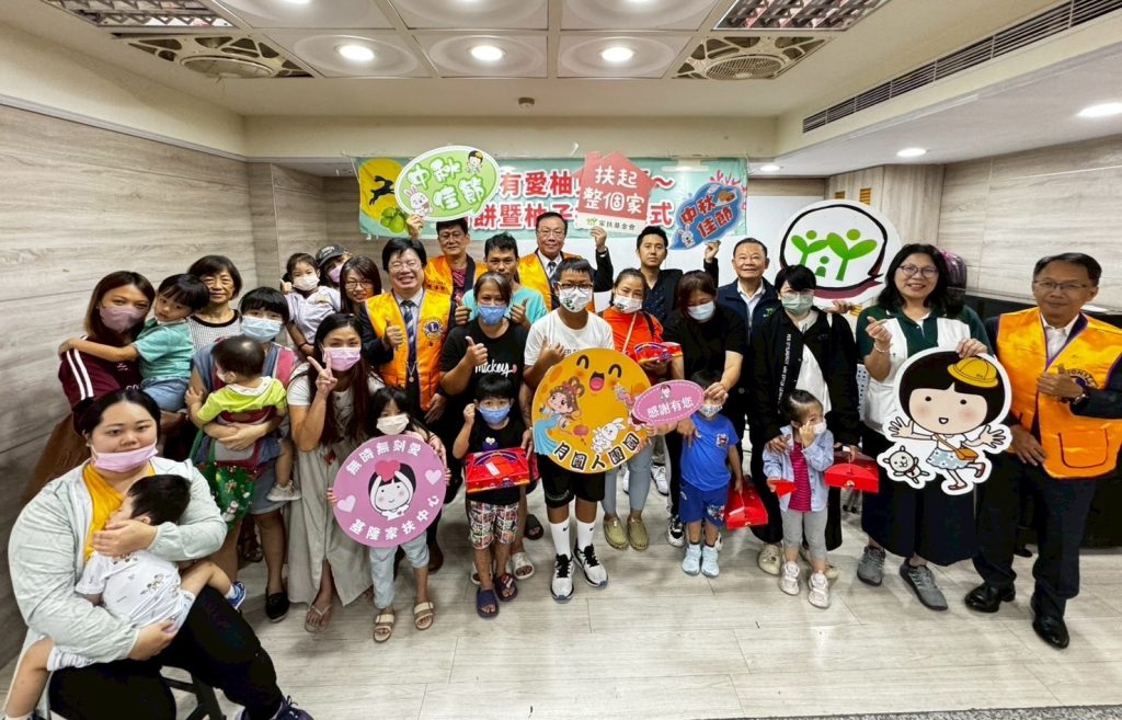基隆海洋國際獅子會張眾佳會長暨獅友們將愛心月餅送給家扶親子。(基隆家扶中心提供)