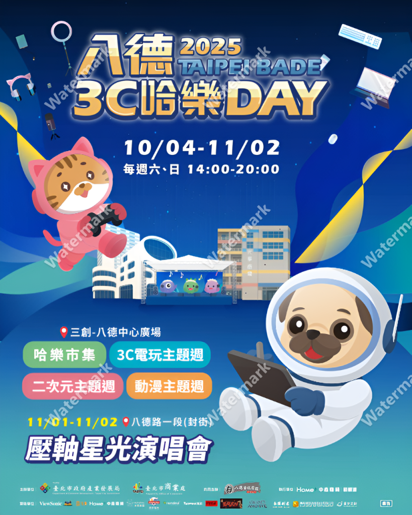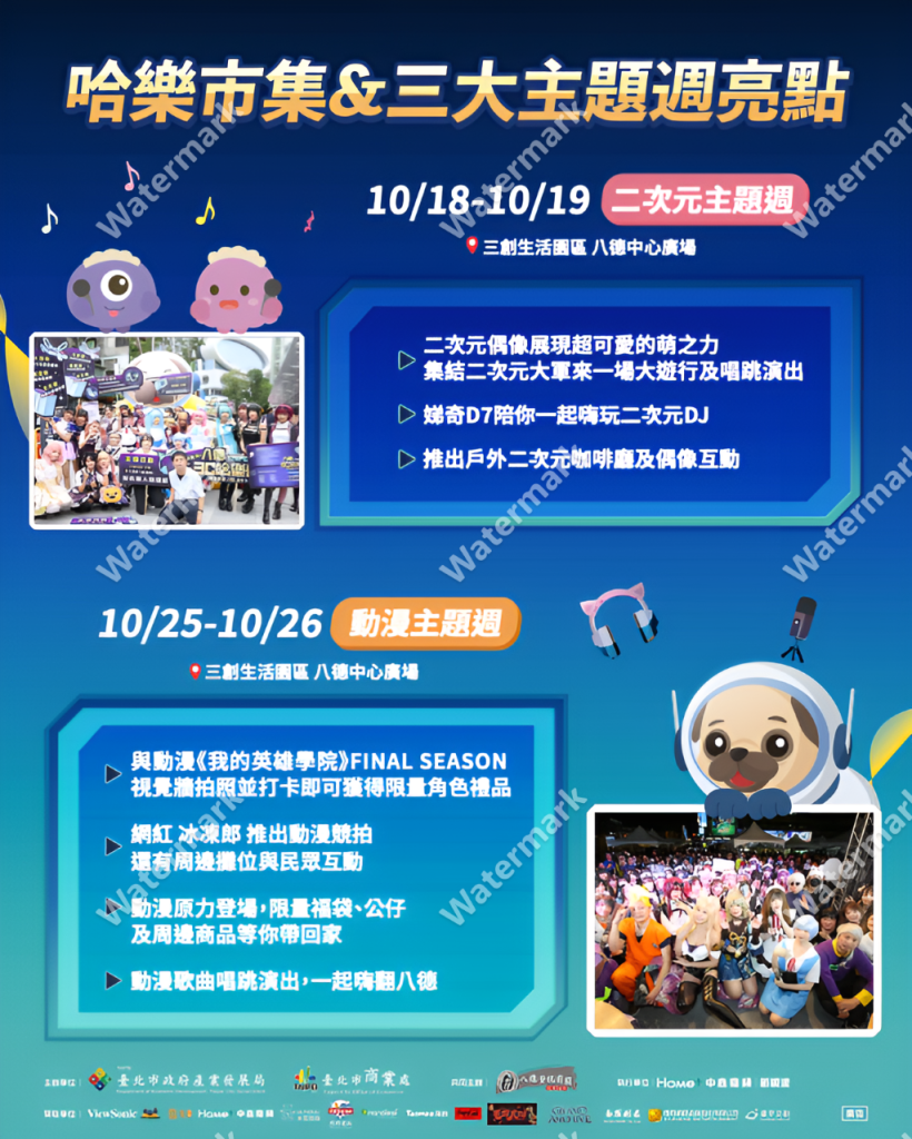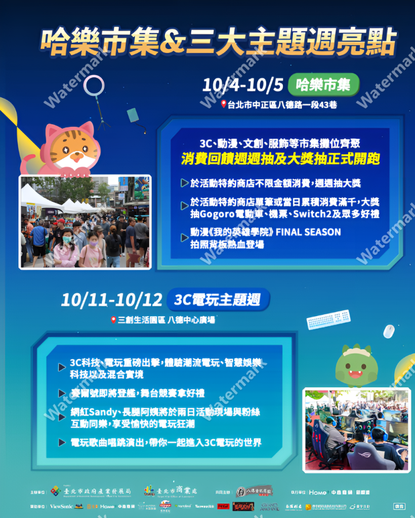 10/4-10/5 哈樂市集揭開活動序幕 10/11-10/12、10/18-19、10/25-26每週末接力推出3C電玩、二次元及動漫等3大特色主題活動:10月4日至5日「哈樂市集」:於八德路一段43巷率先起跑,作為活動前導暖身週,由台北市八德資訊商圈發展協會籌劃,集結文創、服飾及動漫等多元產業攤位,為系列主題活動週熱力暖身。緊接著3大特色主題週將連續3週末於三創生活園區八德中心廣場登場;10月11日至12日3C電玩週:尬翻全場,結合經典手遊《賽爾號》,奇幻冒險《風之國度》、全新Switch 2體驗搶先玩!還有《nanoleaf》光影互動牆、SoundBox 智慧娛樂體驗、《Metapunch》混合實境拳擊挑戰等,打造沉浸式電玩世界。現場更邀請創作者Sandy與知名直播主長腿阿姨互動同樂,掀起最熱血的電玩狂潮;10月18日至10月19日二次元主題週:接棒上陣,二次元偶像大軍街頭遊行超萌吸睛!現場設有二次元戶外咖啡廳帶來萌系互動與主題餐點,包含Douwa Koti Maid Café、魔女學院WitchHat、異世界咖啡館•澐月、時刻動漫町、愛神•阿芙羅黛蒂、Rêves夢色及阿克蒂雅Arkadia咖啡廳微笑獻上「歡迎光臨」;此外,10月19日還有網紅娣奇D7開起二次元DJ派對,一起在八德3C舞動身心!