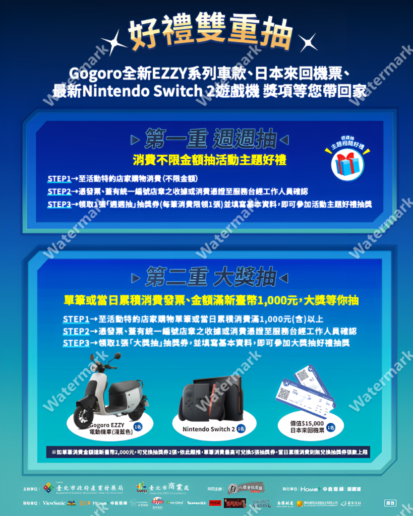 為回饋消費民眾,10月4日至11月2日期間還有消費雙重抽活動,於八德資訊商圈、光華數位新天地及三創生活園區(含三創生活園區全櫃位)等特約店家消費,不限金額即可至活動服務台參與週週抽,每週依主題抽出20份以上驚喜好禮;另消費單筆或當日累積滿千元還可再參加大獎抽,有機會獲得Gogoro EZZY、日本來回機票、Switch 2遊戲機等總獎值近新臺幣30萬元豐富豪禮。更多活動相關資訊歡迎至「台北市商業處-我是商Ya人」FB粉絲專頁(www.facebook.com/tcooc )及台北市八德資訊商圈發展協會FB粉絲專頁(www.facebook.com/bade8888 )查詢。