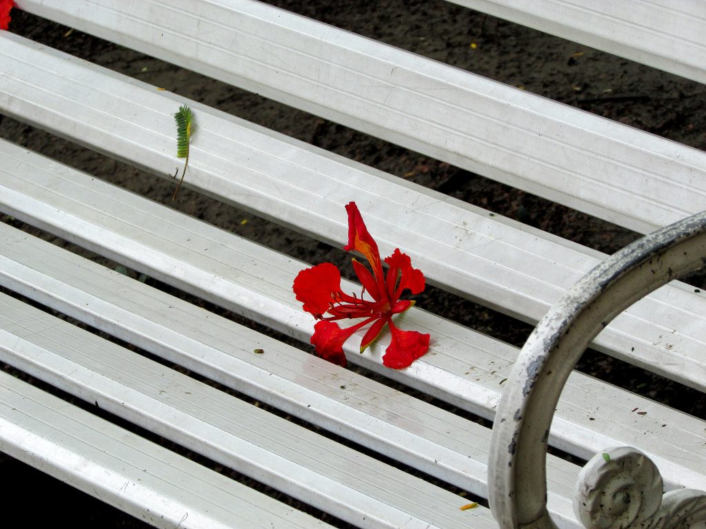3.有一次,又是空手而回,清晨通往河畔公園的迴旋高架陸橋上,只有路邊高高的鳳凰花紅紅火火地兀自開著,陸橋的盡頭對著空曠公園的上空,有人也兀自在地上一字腿拉筋伸展柔軟瑜珈,但初陽尚未升起。我沒駐足按下快門。