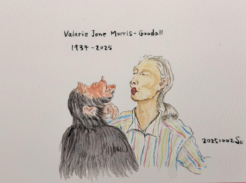 英國知名動物學家珍古德於本周辭世,享壽91歲。桃園市副市長蘇俊賓在臉書發文,並親手繪製紀念明信片,追憶這位對他影響深遠的環境運動先驅。蘇俊賓表示,珍古德是他在生態與環境意識上的啟蒙,從她身上看到無比的勇氣,也相信了只要有信念與熱情,就能打破知識的藩籬與框架。他回憶二十多年前,與太太一同參與珍古德相關活動的場景,如今聽聞她辭世,讓人感激與不捨。