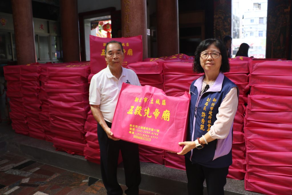 位於土城區的五穀先帝廟,以奉祀教耕稼、嚐百草、造民曆的神農炎帝為主神,於中秋節前夕,捐贈360箱民生物資及800斤白米給新北市社會局實物銀行,由社會局副局長許秀能代為受贈,將轉送給土樹三鶯地區服務在案中的弱勢家庭,另白米則提供給老人共餐點和社福機構。