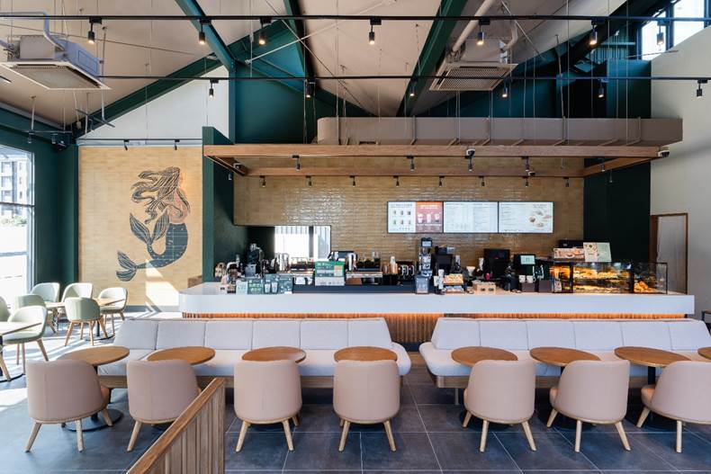 北光天窗引入自然光,讓室內空間沐浴在柔和的光影之中,營造靜謐而溫馨的氛圍。整體設計以米色與鼠尾草綠為主調,搭配溫潤木質元素與活潑點綴色彩,展現和諧卻富有層次的美感。門市藝術牆上的星巴克女神,更象徵著為在地社群帶來一方舒適自在的咖啡時光。