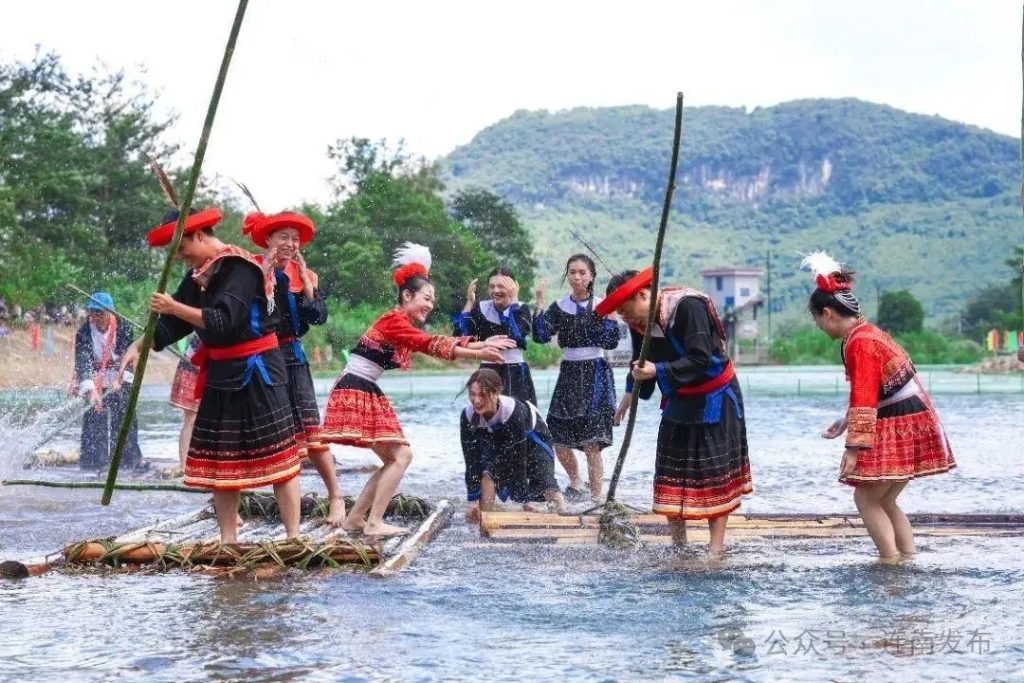 九寨河上,莎腰妹與阿貴哥立於竹排對唱,水面蕩漾著歌聲的浪漫情懷。隨後,身穿盛裝的瑤家漢子追逐清流,展現力量與豪情,田野間的互動遊戲更是熱鬧非凡,抓鴨子、抓泥鰍、全民抓魚,還有背起愛人在水田中奔跑的趣味比拼,讓遊客近距離感受瑤山田園的快樂與豐收的喜悅。
