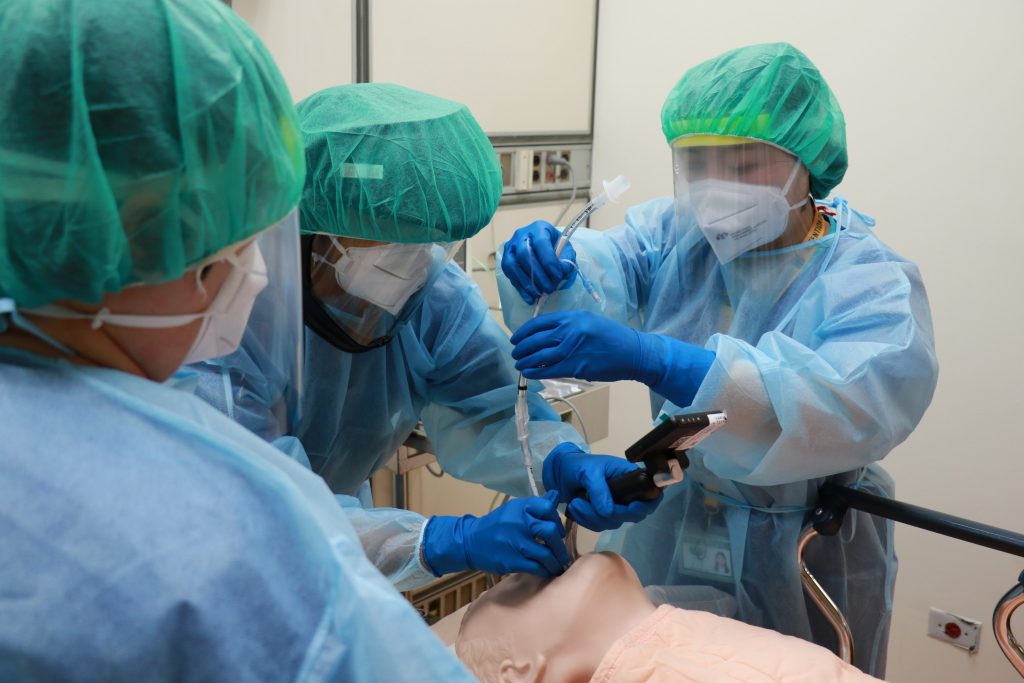 模擬病人病情急轉直下、出現嚴重呼吸窘迫時,專責插管小組啟動高風險插管程序。醫師、呼吸治療師與護理師組成的團隊在全套防護措施進行插管,採用密閉式抽吸系統、人工鼻與一次性呼吸器管路等專業設備,確保操作過程安全有效。前室人員協助物資傳遞與通訊聯繫,展現嚴謹分工與團隊合作。