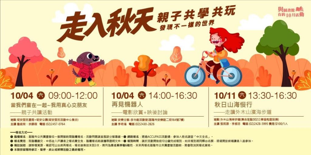 基隆市公共圖書館「圖書館有約」系列活動,十月份規劃親子共讀、電影欣賞與主題討論等多元內容,邀民眾一同透過閱讀與互動走入秋天,發現生活中不一樣的世界。