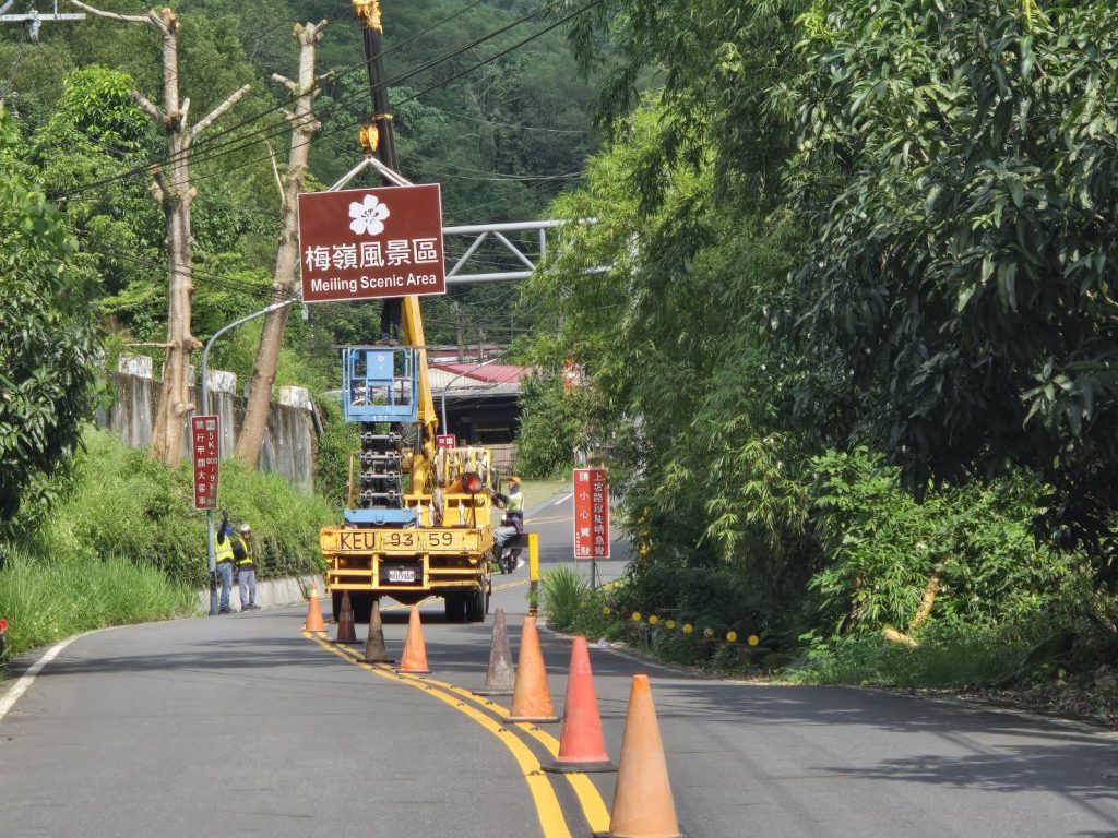 梅嶺正展開大大小小設施修建,也更新路招。(記者張淑娟攝)