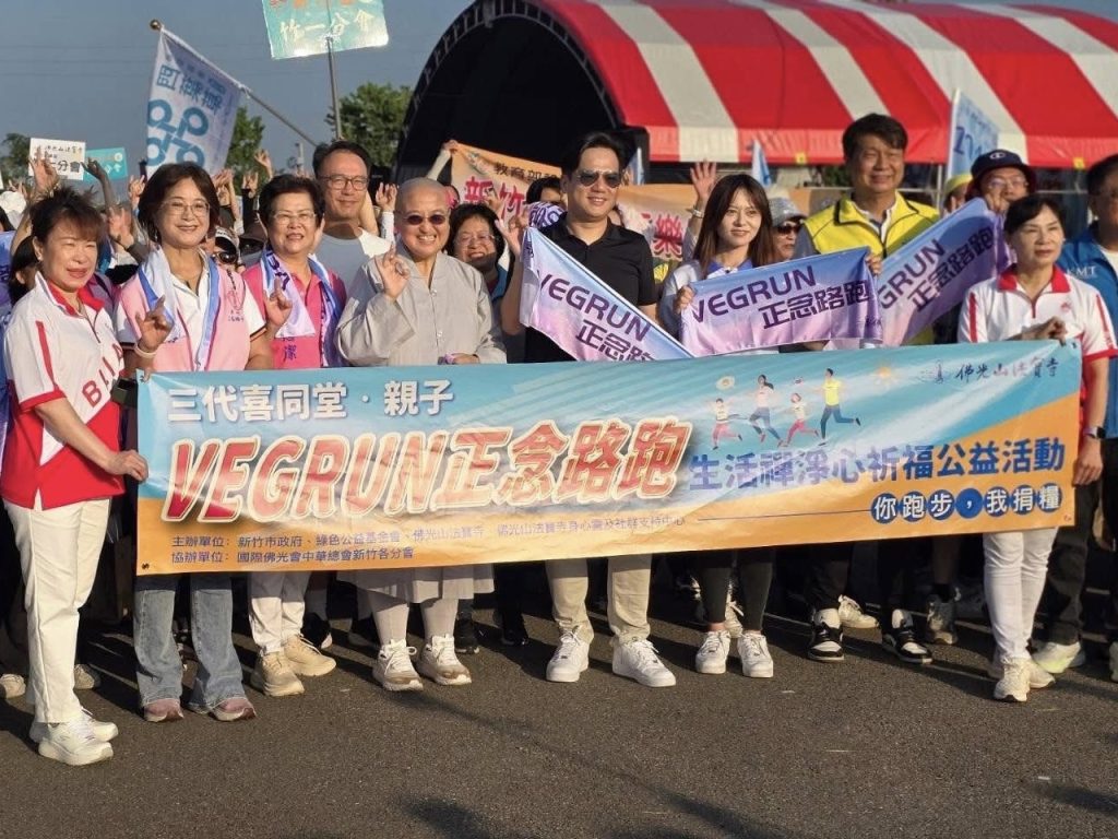 為倡導全民運動、推廣健康生活理念,新竹市佛光山法寶寺四日清晨於頭前溪左岸壘球場旁舉辦「二0二五三代喜同堂VEGRUN正念路跑&生活禪靜心祈福公益活動」熱鬧開跑,由代理市長邱臣遠與法寶寺監寺覺舜法師共同帶領跑者暖身起跑,現場氣氛熱絡。