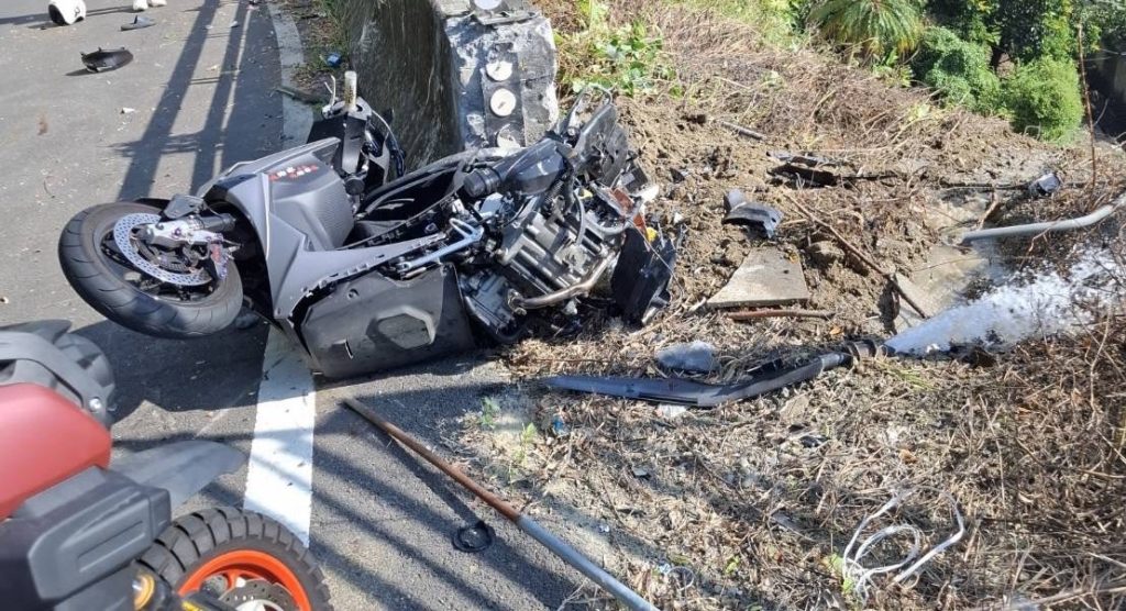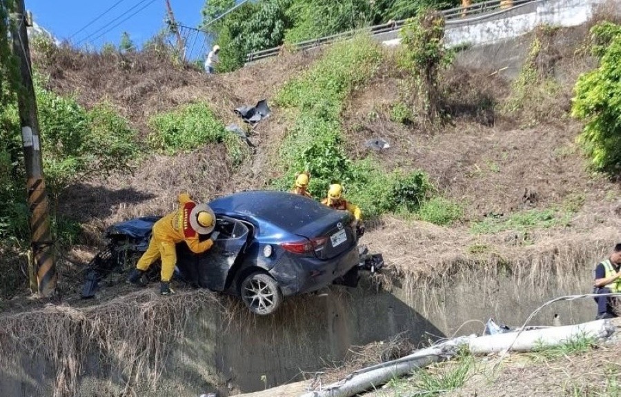 疑撞擊力相當大,轎車嚴重變形,消防隊先進行固定,避免滑落,接著再破壞車體,並使用繩索救援技術協助人員脫困,連同騎士,迅速將三名傷者緊急處置後送醫救治。