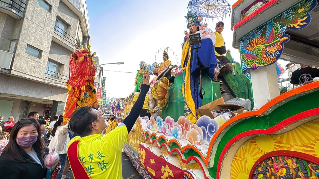 五日下午彰化媽聖駕遶行市區,贊助單位組成十四輛「傳統真人藝閣」車隊迎接。藝閣車隊沿途拋送附有禮品兌換券的「扭蛋」給恭迎媽祖的信眾,禮品有精品馬桶、精品蓮蓬頭、電視機、帽子、包包、保溫杯、沐浴乳、文創小錢包、運動毛巾等。