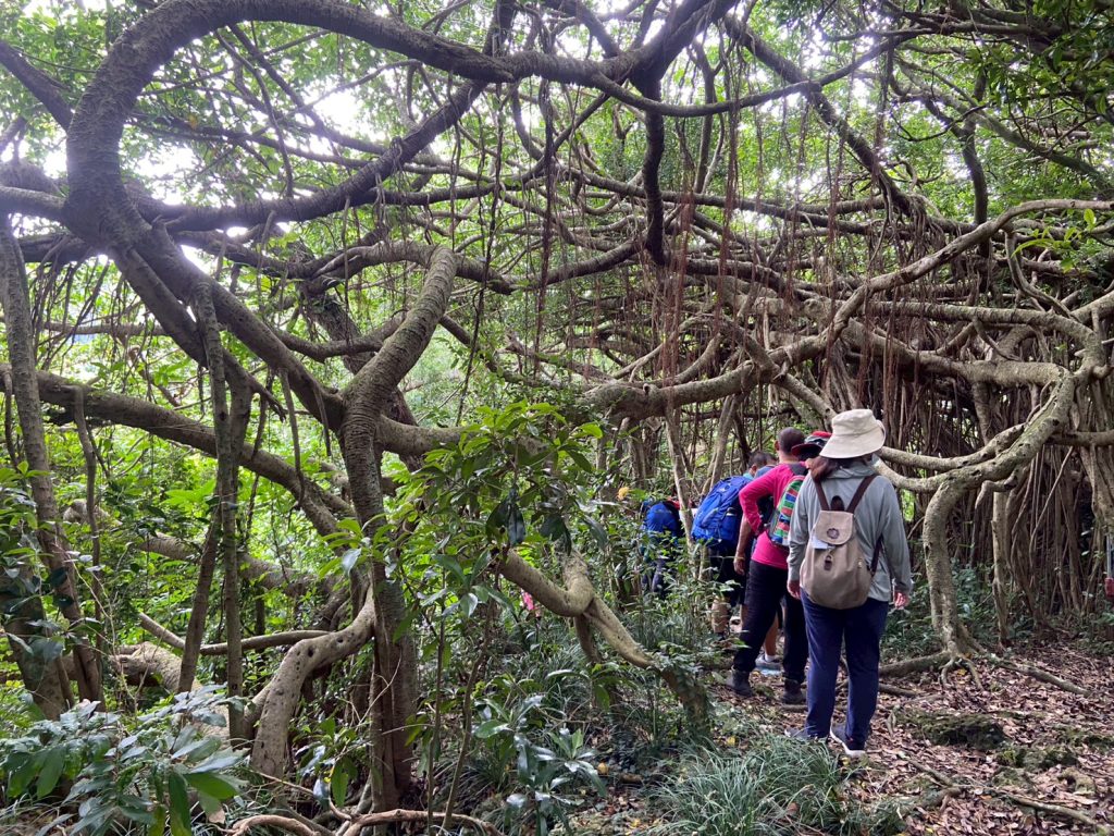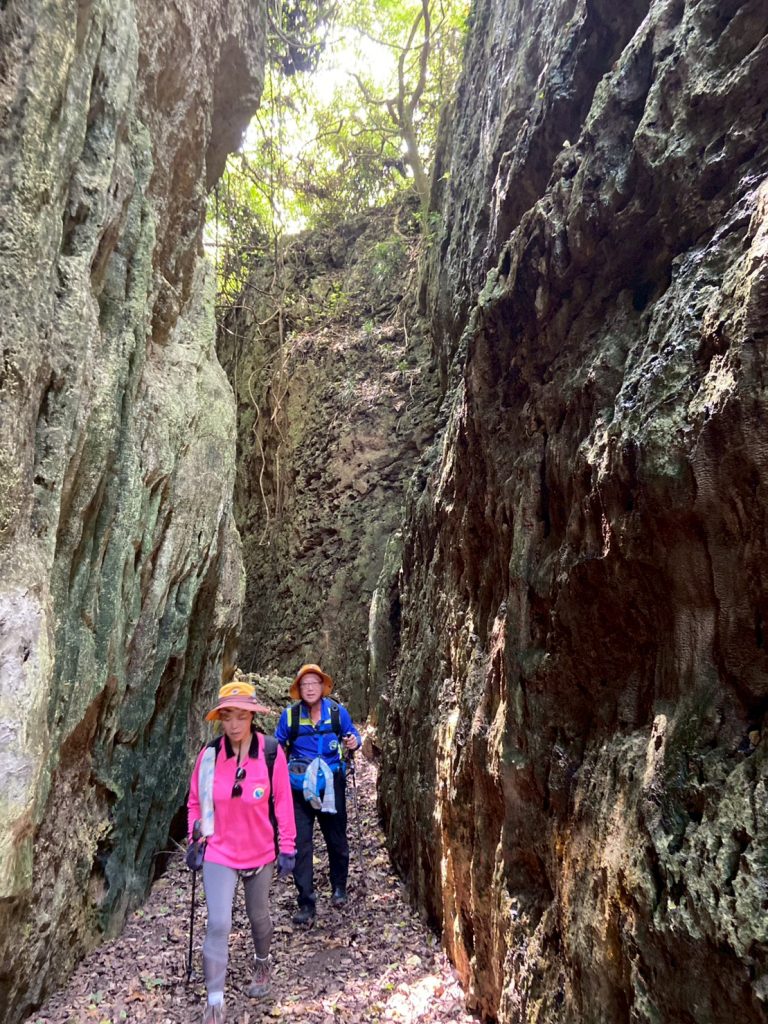 先是大峽谷,這要學猴子手腳並用的攀爬,再來更是路寬僅一人可側身走的小錐麓,確實要膽大心細,慢慢走,通過了考驗後,來到百餘年的七里香老樹群,更有盤根錯節的老榕,可以好好的吃個午餐,以便再進入泰國谷和那美麗的一簾幽夢,來到如此美景,大家肯定要爭相拍照留影的,接著京到了猴岩,也許猴兒都休息去了,在山徑上未見到成群的獼猴,頂多就是落單的一兩隻坐在步道上納涼。