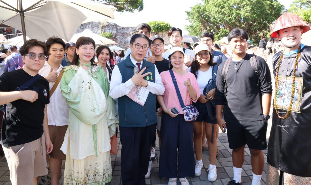 台南最具歷史風味的沉浸式市集展演「熱蘭遮市集」,以十七至十九世紀的台灣為時空背景,重現熱蘭遮市鎮的繁榮貿易風貌。市長黃偉哲驚喜現身熱蘭遮市集與遊客合影留念,現場人潮絡繹不絕。