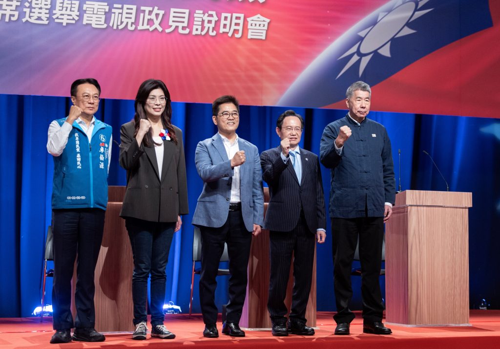國民黨主席選舉電視政見說明會五日舉行。圖為黨秘書長黃健庭(中)與候選人卓伯源(左)、鄭麗文(左二)、蔡志弘(右二)與張亞中(右)。(中央社)