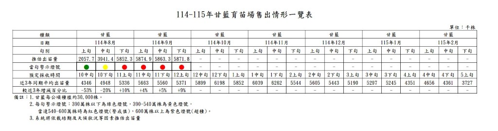 農糧署說明,為協助農友掌握最新種植情況,該署透過專業育苗場供苗量、遙測判釋及氣候資訊確認種植情形,再輔以產地訪視及洽農民團體了解實際種植情況後,每旬(10日)於官網發布「大宗蔬菜播種量及供苗預警資訊」供農友參考。此外,該署亦每月發布生產預測資訊,供農友掌握資訊、調整生產規劃,降低風險。農糧署進一步說明,供苗預警資訊分為綠、黃、紅及紫色4種燈號,綠、黃燈代表種植面積在合理範圍內,紅燈代表農民種植面積已達合理需求上限,紫燈則代表已嚴重超量種植。