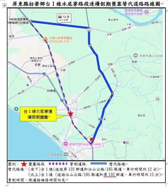 在車流湧現時其替代路線,南下台一線佳冬戰備跑道四三一K處左轉屏一三二線接縣道一八五線沿山公路回台一線,北上台一線四三九K沿山公路口處右轉縣道一八五線沿山公路接屏一三二線回台一線。枋山鄉枋山大橋至楓港路段實施調撥車道,依車流量狀況,機動性實施北上車道調撥,沿線封閉非必要的中央分向島缺口。