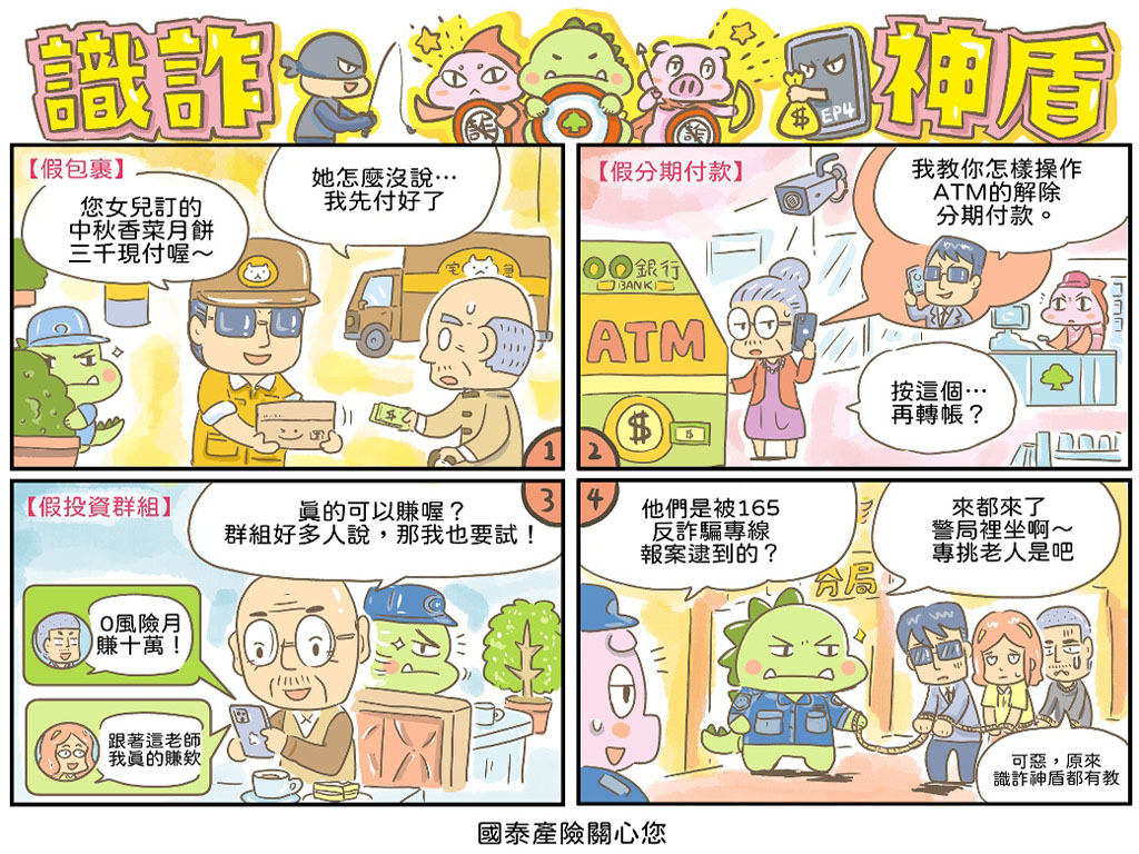 除了防詐共識營,針對日常員工教育訓練,國泰產險今年起推動「識詐素養培育計畫」,參考內政部警政署165打詐儀錶板之最新詐騙案例,導入每月識詐影音學習機制,邀請全體同仁觀看識詐影片並完成測驗,強化同仁在日常生活及業務中,辨識詐騙的敏銳度與應變力。對外推廣方面,國泰產險每季定期推出「識詐神盾」漫畫系列,以淺顯易懂、貼近生活的漫畫內容,結合真實案例與防詐技巧,呈現不同族群可能遭遇的詐騙情境,發布於國泰產險官方網站、官方LINE與Facebook平台,讓防詐知識深入社群、走入日常,實踐企業社會責任。