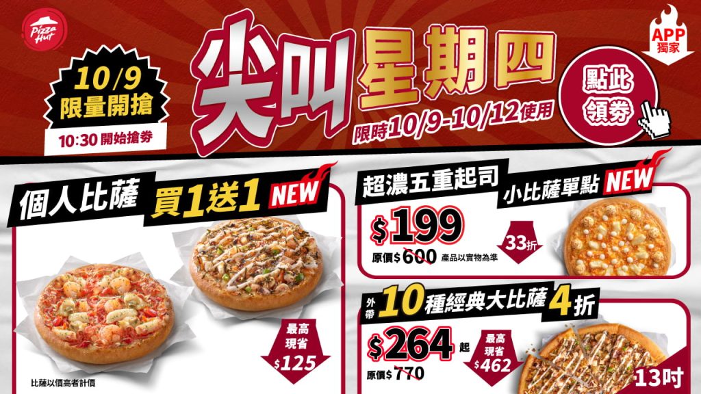 必勝客【尖叫星期四】每週四上午10:30準時開搶!有大比薩4折、功夫雞套餐62折、個人比薩買1送1等多項優惠,快上PK_APP搶購!