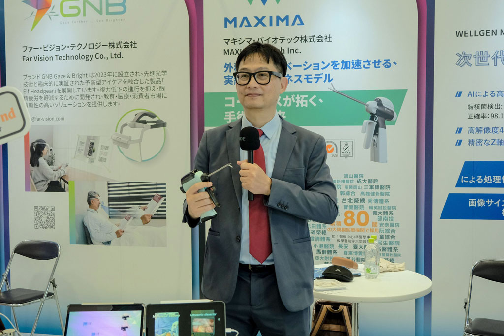 久方生技首次亮相的第二代無線超音波刀,成為展會焦點。湯博士指出,第一代產品在台灣市場已有80家醫院使用,累積超過 5000 例手術臨床數據,並結合台科大機械系及佳世達集團進行全面升級,展現「在地化創新」的成果。他強調,台灣真實臨床數據是獲日本肯定的關鍵,也證明台灣具備推動醫材國際化的能力。