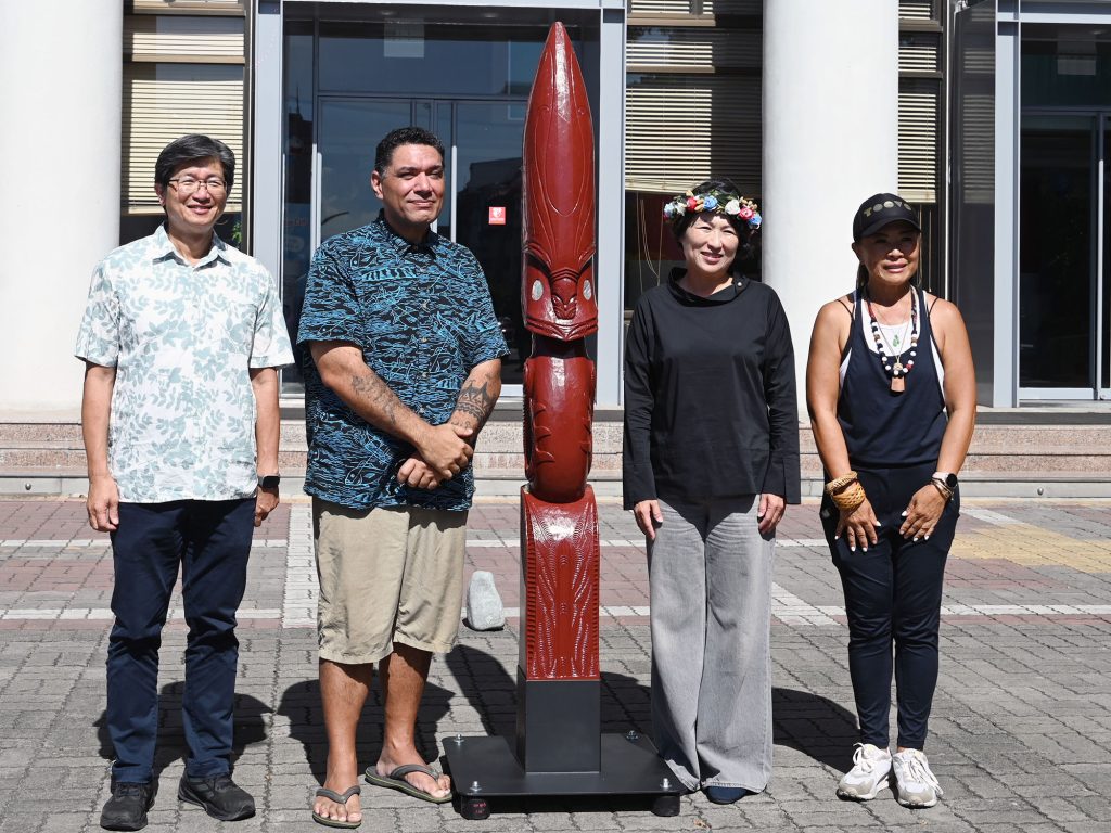 台東縣長饒慶鈴七日代表接受來自紐西蘭造舟大師Heemi Eruera致贈的「星空羅盤雕刻柱Pou Haere」,象徵南島航海文化的交流與延續。饒慶鈴表示,未來將陸續完成東、南、西、北四個方位的雕刻作品,預計於二0二六年台東博覽會全貌亮相。
