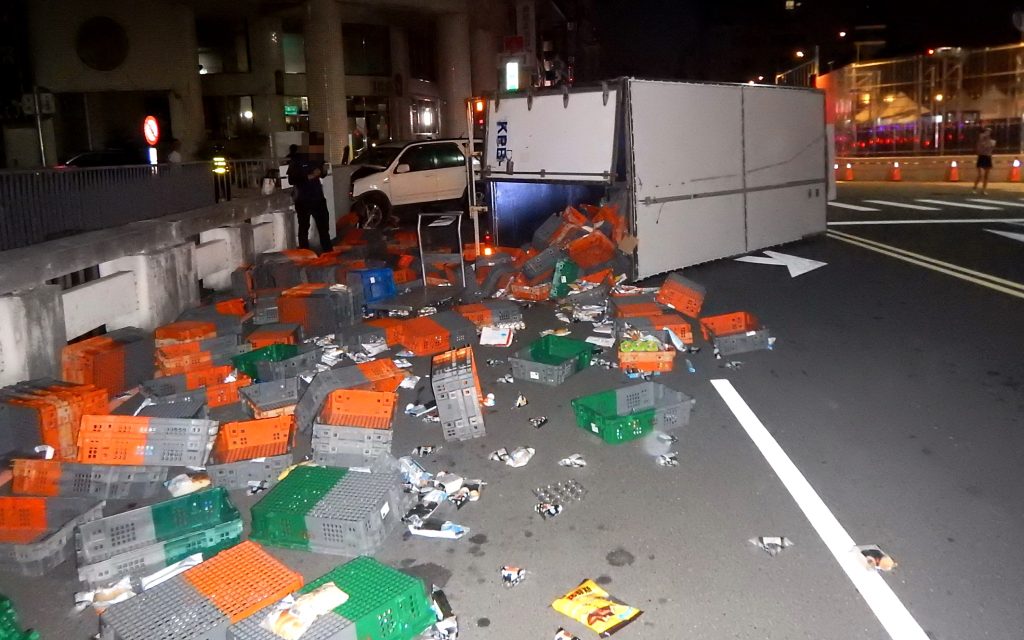 三十二歲詹姓男子七日凌晨酒後開車載友,行經台中市北區一處無號誌路口時,撞上已通過路口的貨車,造成貨車側翻,貨斗內的貨品散落一地,也造成詹男等四人受傷。警方調查,詹男酒精濃度已超標,警詢後依公共危險罪嫌送辦。