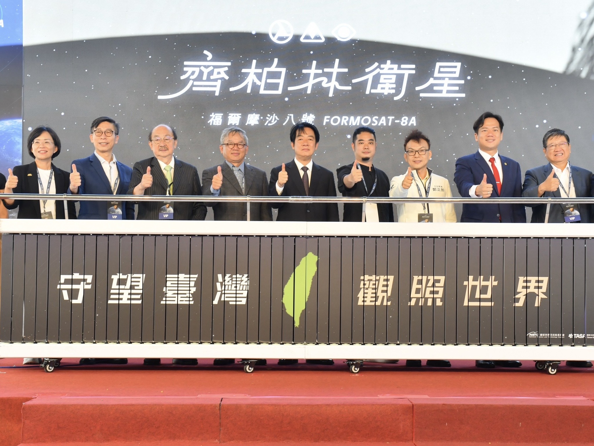 賴清德表示,福衛八號是台灣首顆自主星系衛星,象徵我國太空科技的重要里程碑,將以更高解析度接續福衛五號,持續守望台灣、關照世界。他強調,政府推動第三期太空科技發展長程計畫成果豐碩,太空產業是國家戰略重點,未來將打造「Made in Taiwan」太空產業鏈,並運用衛星資料於國土規劃、農業監測、災害應變及環境保護,強化國家韌性,讓世界看見台灣。
