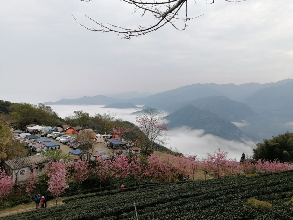 第二天轉搭小巴前往新竹五峰海拔約一千兩百公尺的山上人家,農場內種植顏色偏白的吉野櫻、偏淡桃色的富士櫻,櫻花沿著山坡種植,放眼望去十分壯觀,絕對是追櫻族不可錯過的櫻花秘境,坐在被吉野杉圍繞的森林咖啡館,觀賞變化多端的雲海瀑布及沿著茶園梯形種植,層層不斷延伸的櫻花海,既療癒又充滿幸福感。