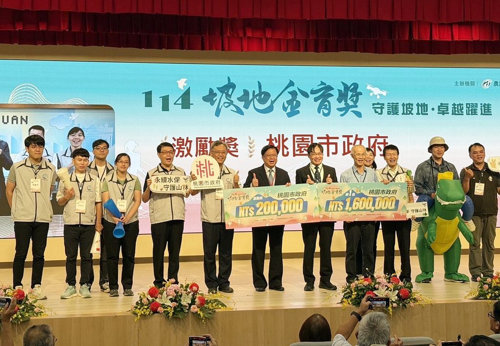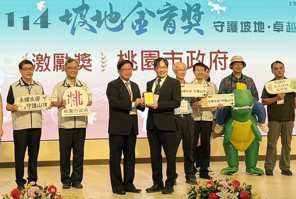 一一三年度農業部主辦「坡地金育獎」考核結果揭曉,桃園市政府自全國脫穎而出,一舉榮獲「直轄市組第一名」、「激勵獎」、「績優水土保持服務團獎」及「個人傑出貢獻獎」等四大獎大滿貫,成為本屆獲獎數最多的縣市,展現市府在水土保持領域的卓越表現與持續精進的決心。此次考評由市府秘書長溫代欣親自率隊出席,並於一一四年十月八日代表市府出席頒獎典禮,彰顯桃園市政府對山坡地管理工作的高度重視。