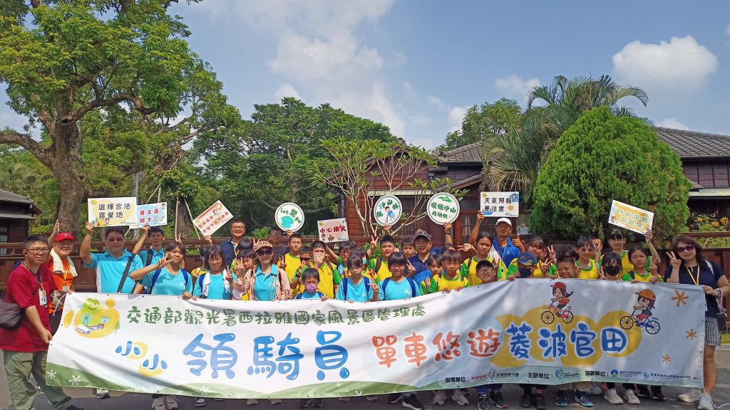 官田國小學童參與交通部觀光署西拉雅國家風景區管理處單車遊,體驗「小小領騎員、單車悠遊菱波官田」活動,深入官田地區豐富的生態與人文風情,並前往環教設施場所認證的烏山頭水庫環境教育園區,透過環境教育課程學習,讓學生能更了解烏山頭水利遺跡。