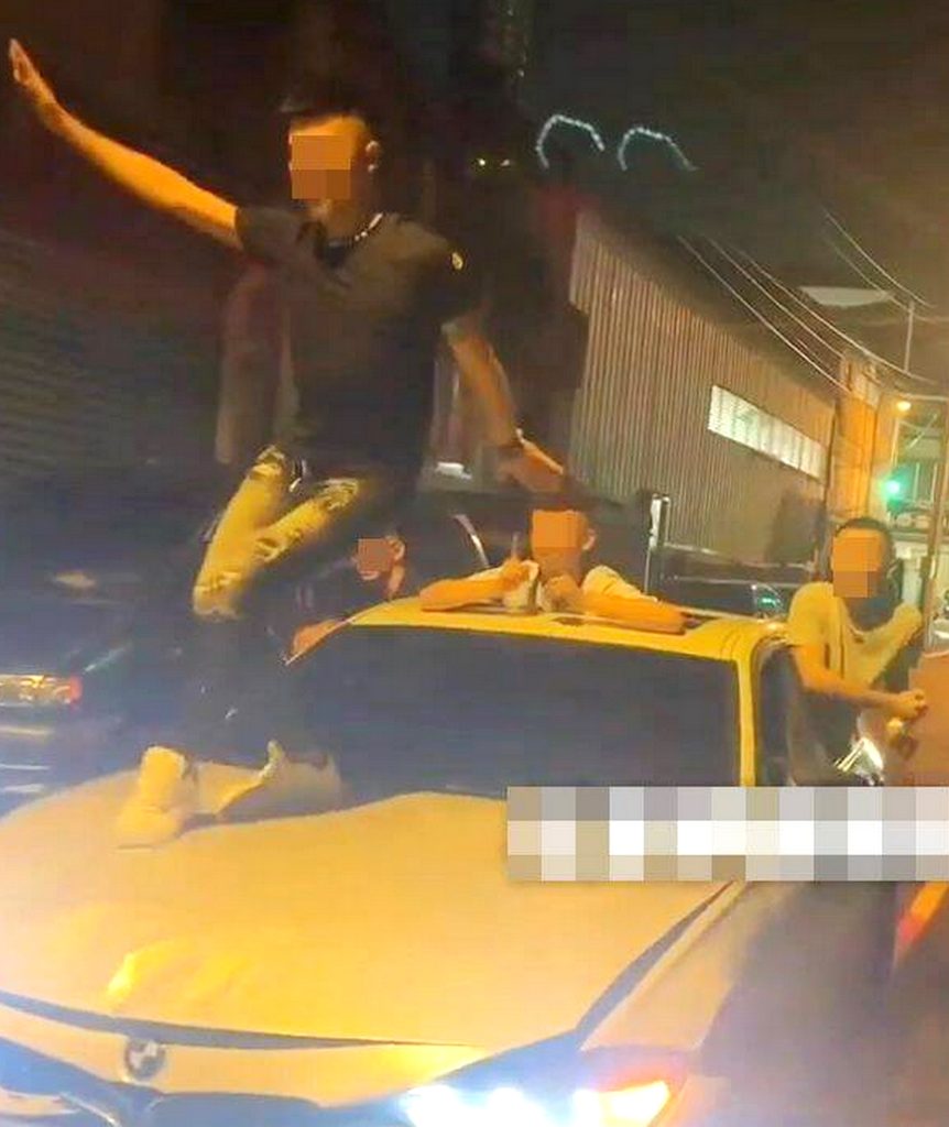 有民眾將一段有人站在行駛中轎車引擎蓋上跳舞的影片上傳臉書社團,影片中可看到,一輛轎車緩緩在巷弄中行駛,前方引擎蓋上則站著一名年輕男子在跳舞,最後還站不穩跌坐在引擎蓋上,後方則有三名男子分別將頭手伸出車窗、天窗,手上還拿著棍子狀似在划船嬉鬧。