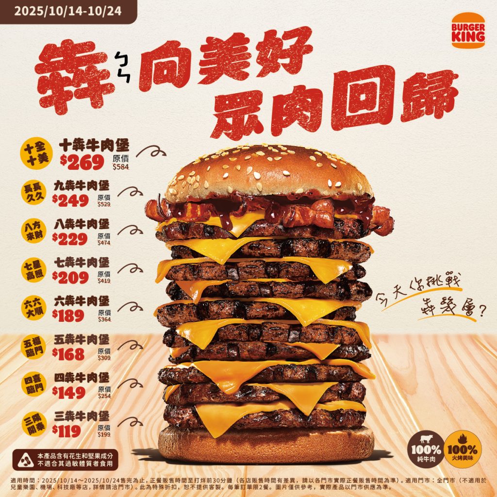 剛出爐的火烤牛肉汁滋滋作響,能想像十層火烤牛肉堆疊的魅力嗎?今年4月短暫回歸一週,即以爆滿肉量加上親民售價引起熱議的犇牛堡,當時讓敢於挑戰大食量的民眾爭相「解成就」;漢堡王時隔半年應消費者呼求回歸,將自下週二(14日)起至24日,限時回歸11天,只要用269元,相當於46折價格,就能享受十層犇牛堡的極限滿足感。