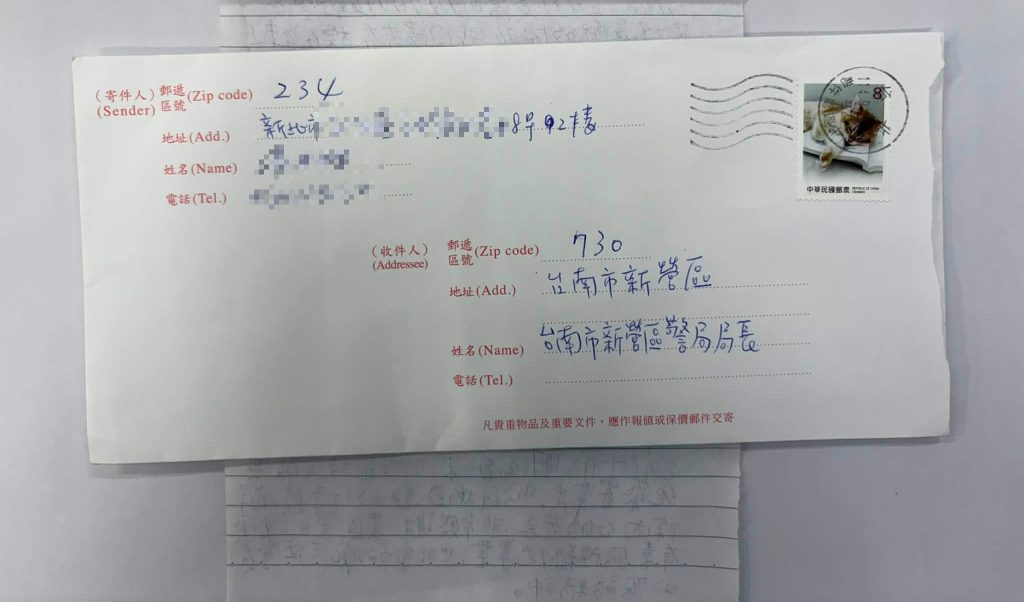 當時備勤警員施品豪立即致電新營火車站詢問,是否有拾獲特徵相符之行李箱,另巡邏員警陳其鴻及楊勝閎,至新營火車站旁轉運站及統聯新營轉運站尋找該行李箱,不久後即在新營火車站旁轉運站找回該行李箱交還婦人,婦人行李箱失而復得,非常感謝員警的幫忙,返回新北市後憶起此事,特地手寫感謝信函稱許施、陳及楊等三員。